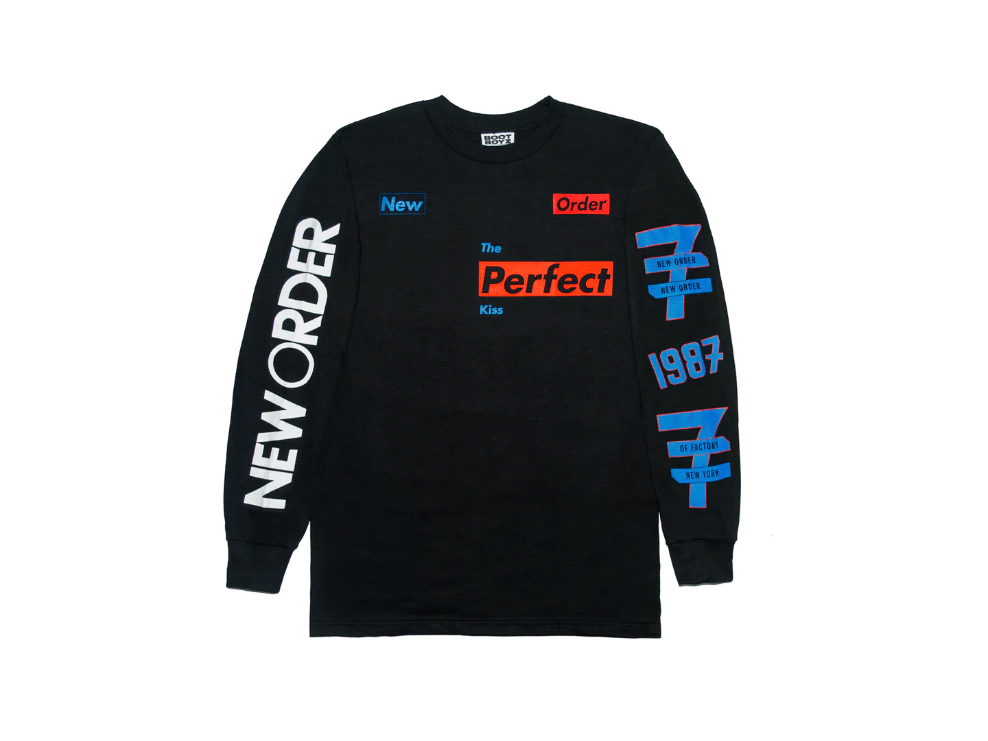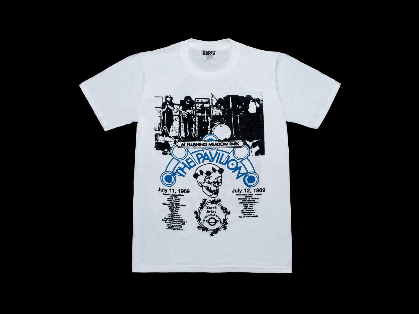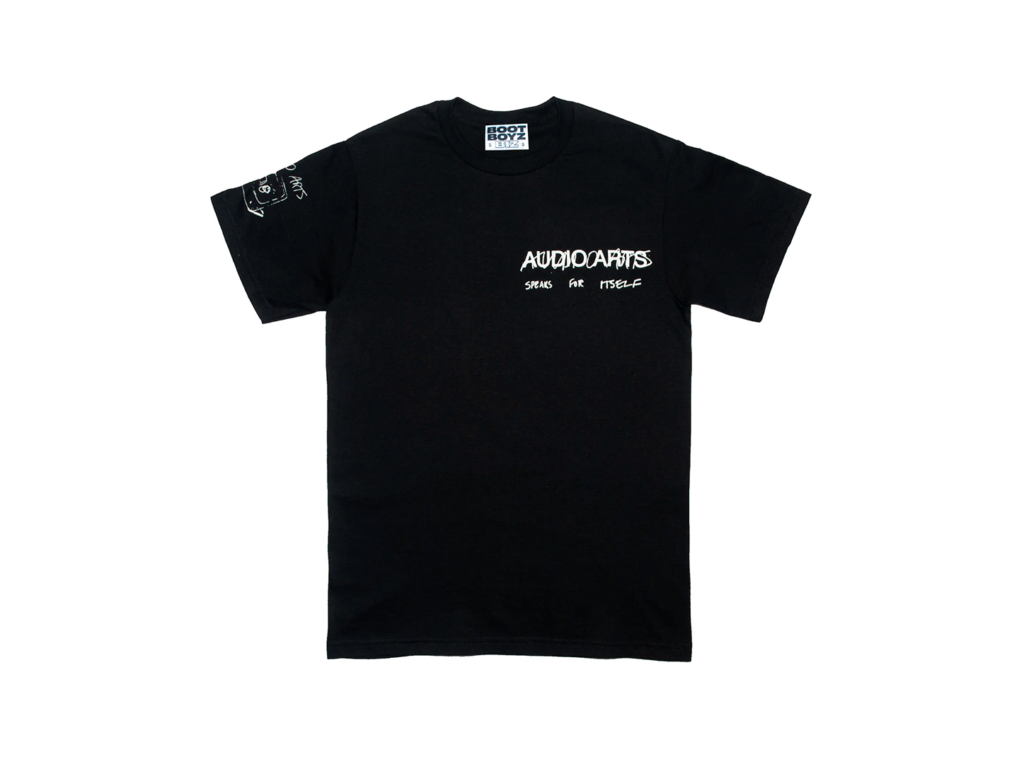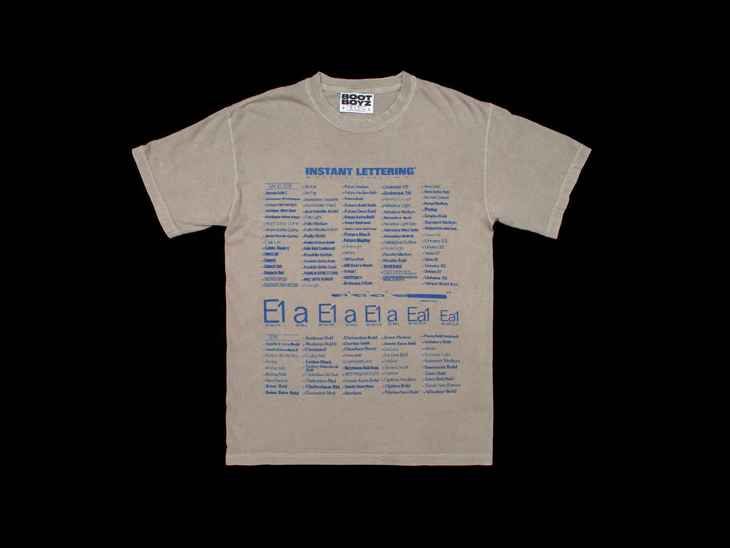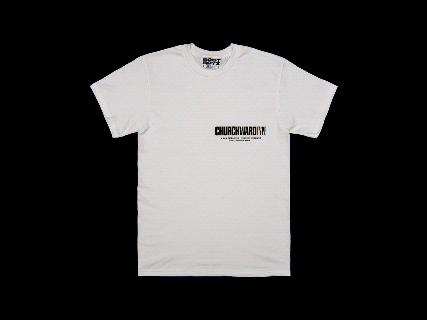 Music forms one of the most consistent reference fields within Boot Boyz Biz, functioning less as band merchandise and more as typographic citation. Rather than portrait imagery or album graphics, these works isolate names, symbols, or fragments tied to underground and experimental scenes, allowing typography and layout to carry recognition. This reflects a broader concern with how subcultural material circulates through record sleeves, flyers, and independent print culture. The shirts operate closer to indexes than commemorative objects, emphasizing recognition and research over fandom.